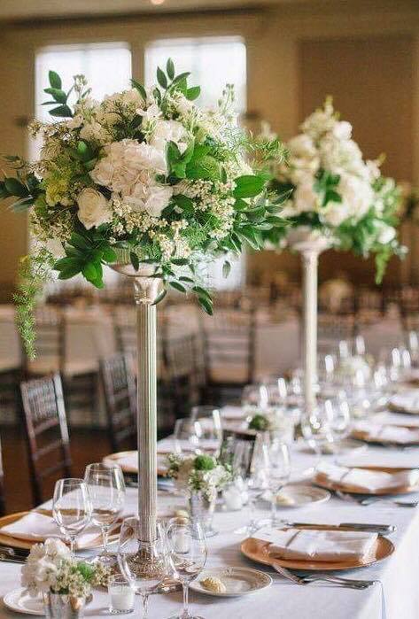 Κεντρικά Τραπέζια (Centerpieces): Από ψηλές, δραματικές ανθοσυνθέσεις με κρυστάλλινα κηροπήγια, μέχρι λιτά μπουκέτα σε γυάλινες βάσεις για μοντέρνο ή minimal ύφος.